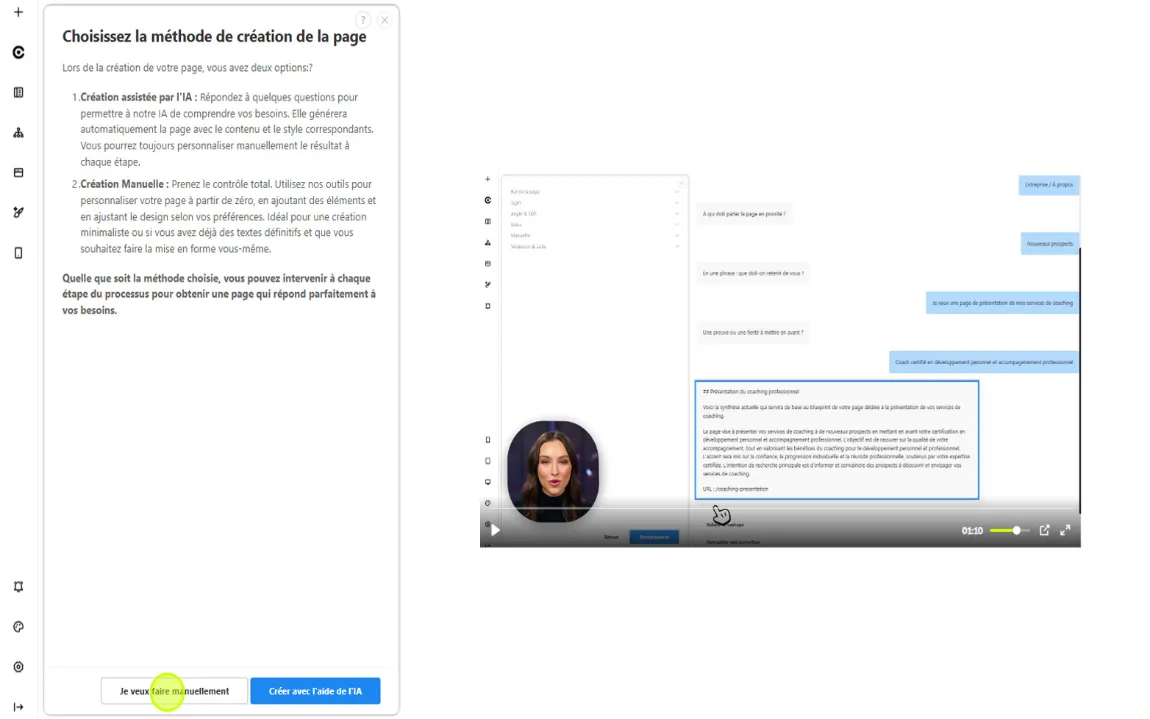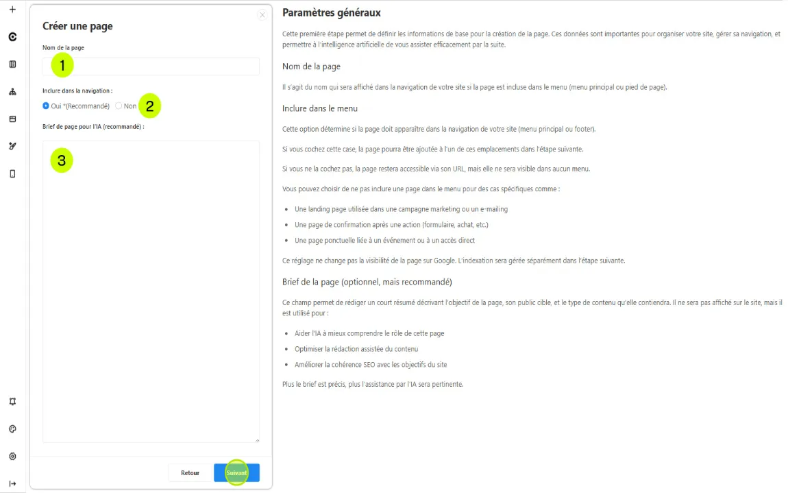 - Mettre un brief de page par l'IA : optionnel en mode manuel, vous pouvez le laisser vide ou le remplir si vous souhaitez utiliser l'IA plus tard pour générer le contenue sur cette page.