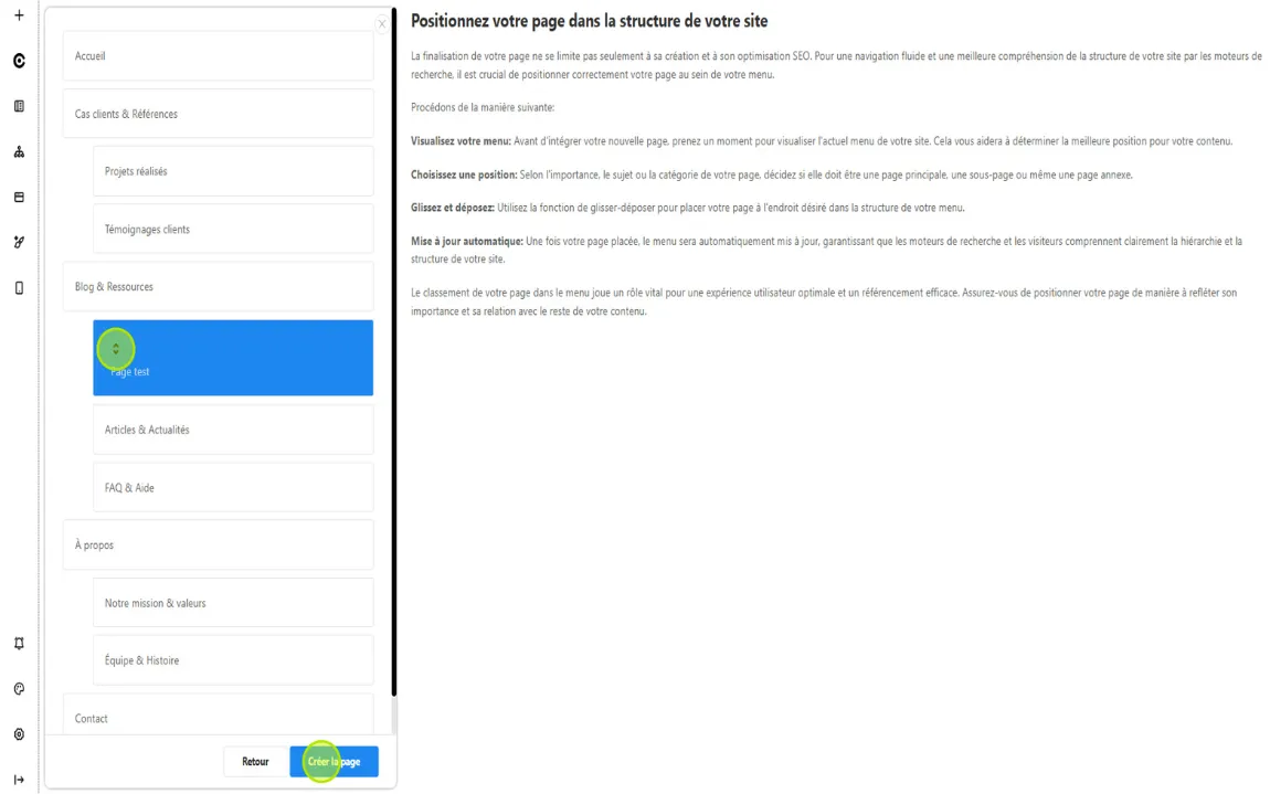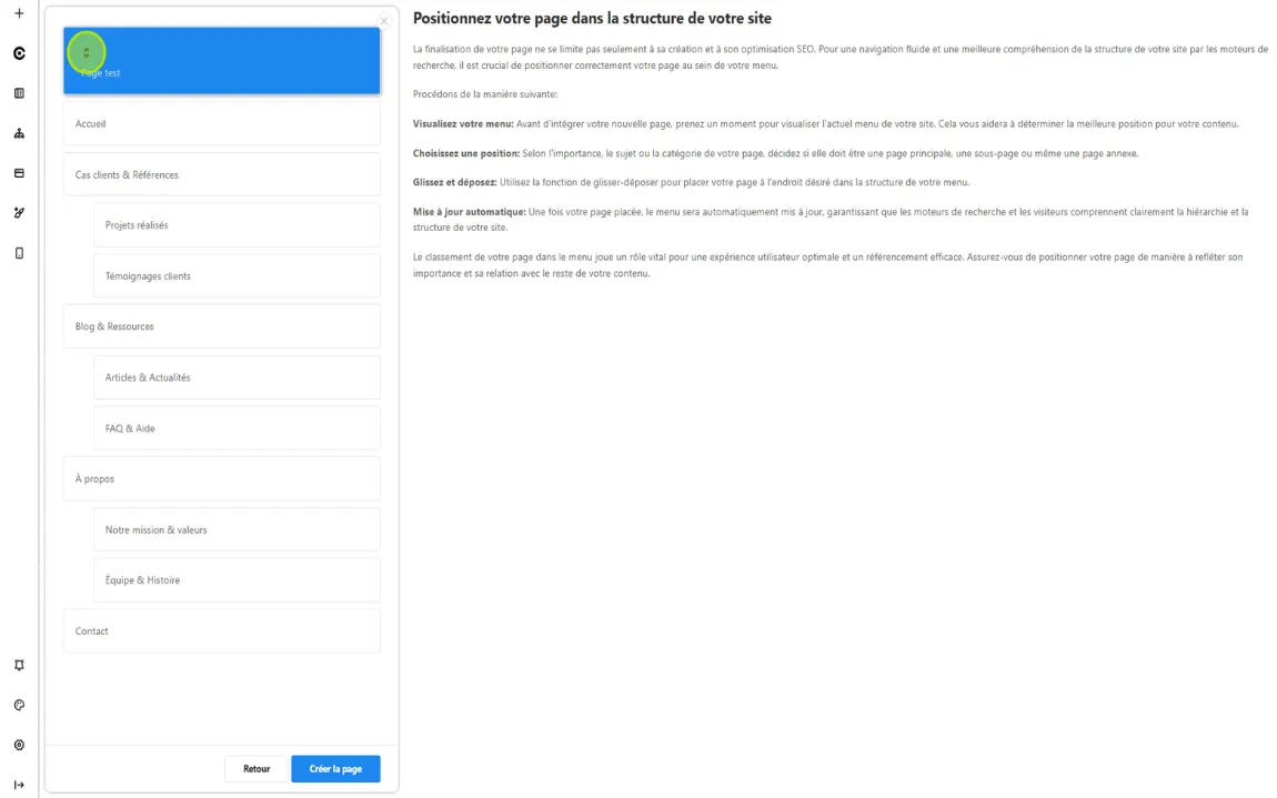 Vous pouvez déplacer les pages verticalement si elles sont sur le niveau principal. Pour passer une page en sous-niveau (2ᵉ ou 3ᵉ niveau), il suffit de la glisser-déposer sur un autre élément. - Cliquez sur « Créer la page » pour finaliser la création
