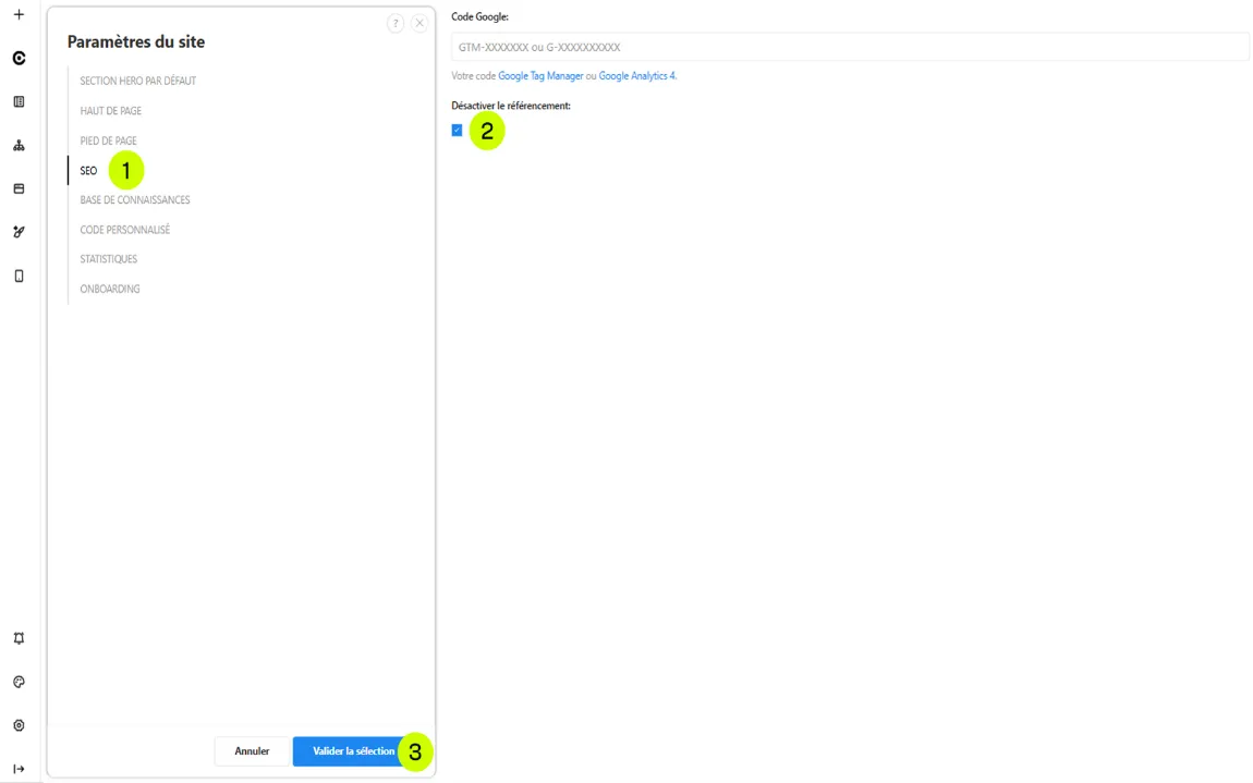 - Cochez « Désactiver le référencement » pour empêcher Google d’indexer le site