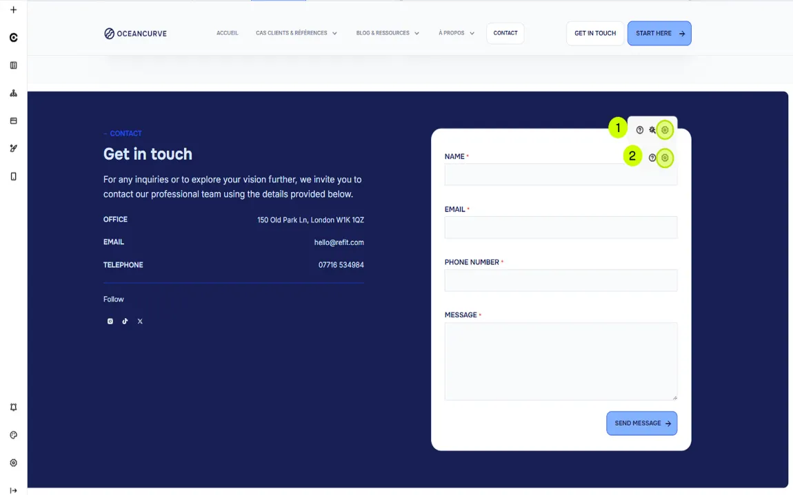 Lorsque vous utilisez un bloc contenant un module formulaire, deux icônes de paramétrage sont disponibles :