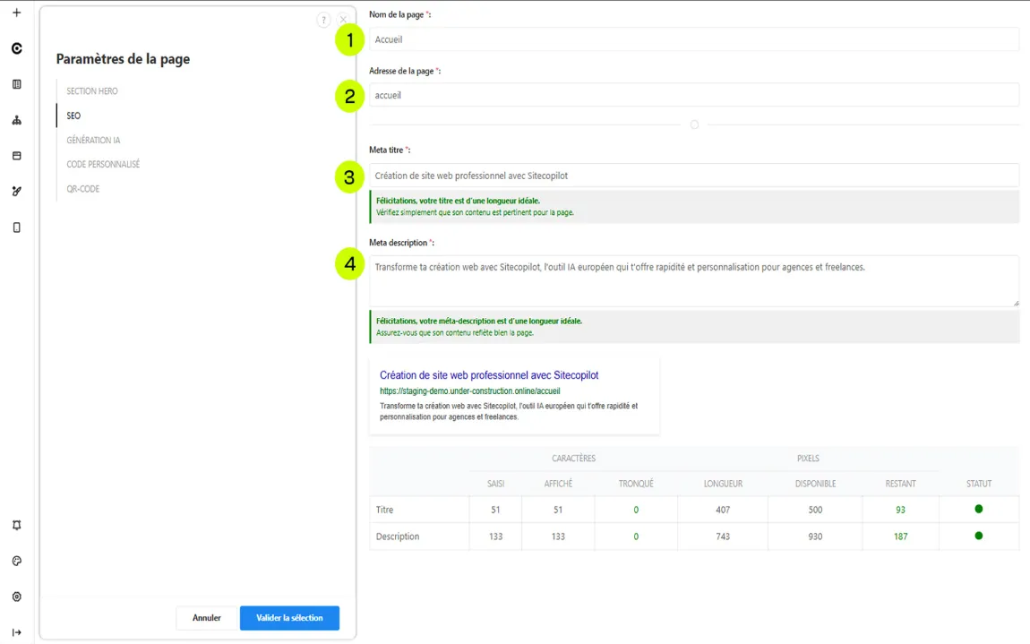 Lors de la création d’une page, l’IA de Sitecopilot propose automatiquement un nom, une URL, un meta titre et une meta description basés sur le contenu de la page et vos paramètres globaux.