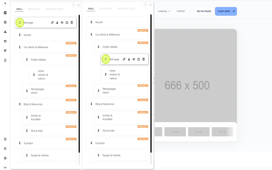 Vous pouvez déplacer les pages verticalement si elles sont sur le niveau principal. Pour passer une page en sous-niveau (2ᵉ ou 3ᵉ niveau), il suffit de la glisser-déposer sur un autre élément.